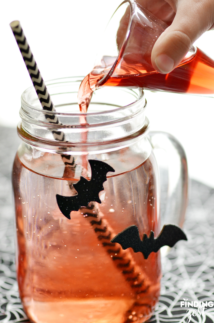 The syringes held the cranberry juice well and the bubble created are cool effect around the syringe! For fun we also added in some bat glitter stickers to make our glasses more spooky.