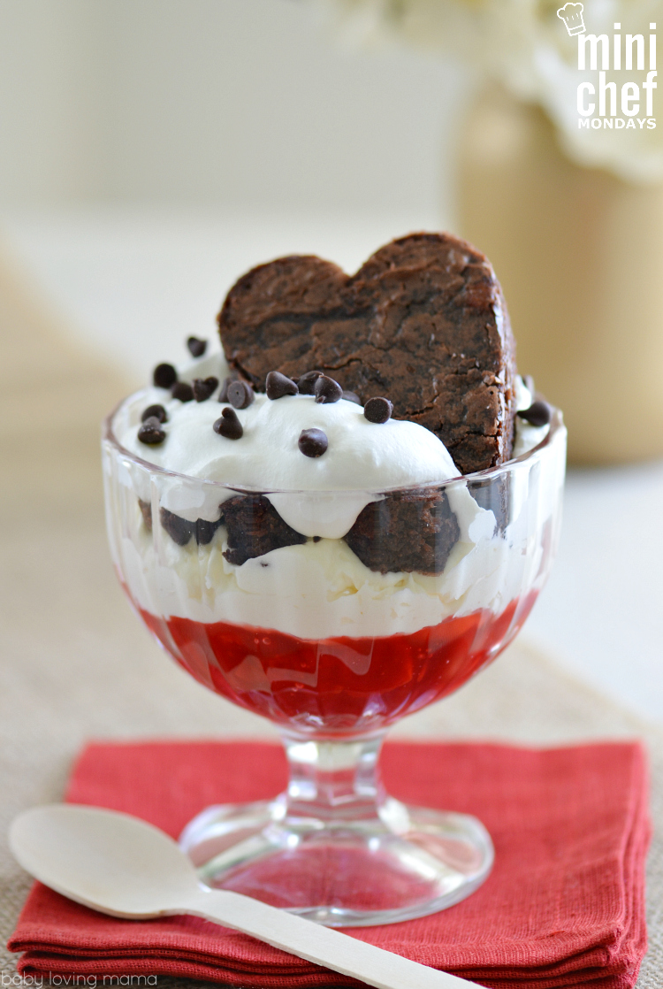 It has been extremely cold here in Minnesota this past week which makes it hard to go outside at all. (It is currently -17 degrees, without the windchill on this sunny Monday morning.) So it is more important than ever to find fun ways to pass the time indoors. Having fun in the kitchen is a great indoor activity and we have taken full advantage. My three year old had so much fun making (and eating) these delicious Cherry Brownie Parfaits with me. These are a great option for Valentine’s Day dessert and perfect for our Mini Chef Monday series.