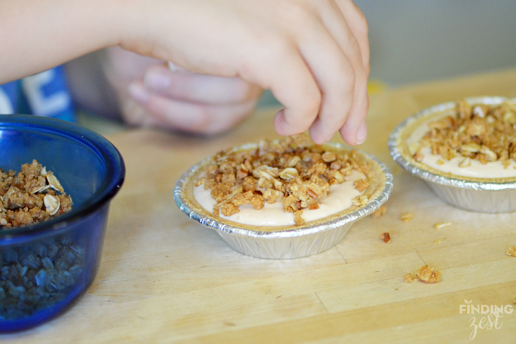 Each container of yogurt is the perfect amount for two pies. Then sprinkle a little homemade oatmeal crumb topping. (If you are short on time, store bought granola works too.)