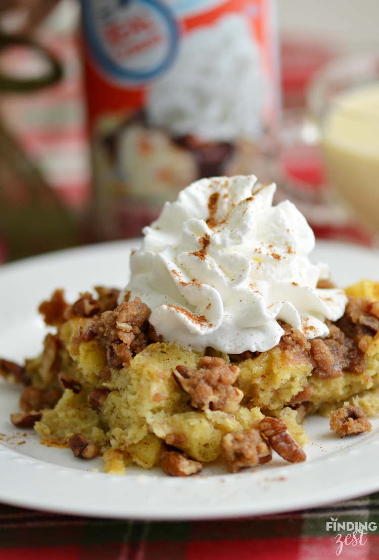A bit of Reddi-wip® and ground cinnamon was just what it needed! Pretty, isn’t it? I was able to pick up my Reddi-wip in the dairy section of my local Walmart. You can also serve it with syrup, but with the sweetness of the streusel topping and eggnog, it really isn’t necessary.