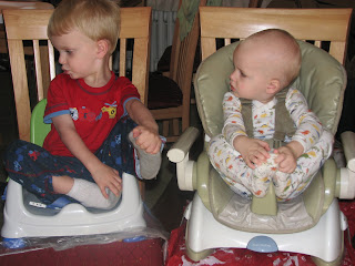 While making pancakes over the weekend I thought it would be nice to put Warren in his chair so he could watch me and to keep him from getting underfoot. Lucian thought this was such a good idea he pulled up his chair and climbed in too so he could watch.